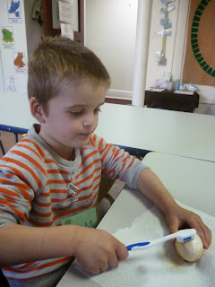 For science today we learned about the importance of brushing your teeth! We asked what happens to our teeth when we drink water or soda. The kids make predictions about whether our teeth stay white or turn brown. We pretended an egg was a "tooth" and put one in a cup of water and one in a cup of soda. The egg in the water stayed white and the egg in the soda turned brown. To clean off our "tooth" the kids used a toothbrush and toothpaste. It is very important to brush our teeth in the morning and at night to help keep our teeth healthy and white!